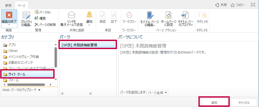 - リボン メニューで、[カテゴリ] の [サイト ツール] から『[SP改] 未既読機能管理』を選択し、[追加] をクリックします。