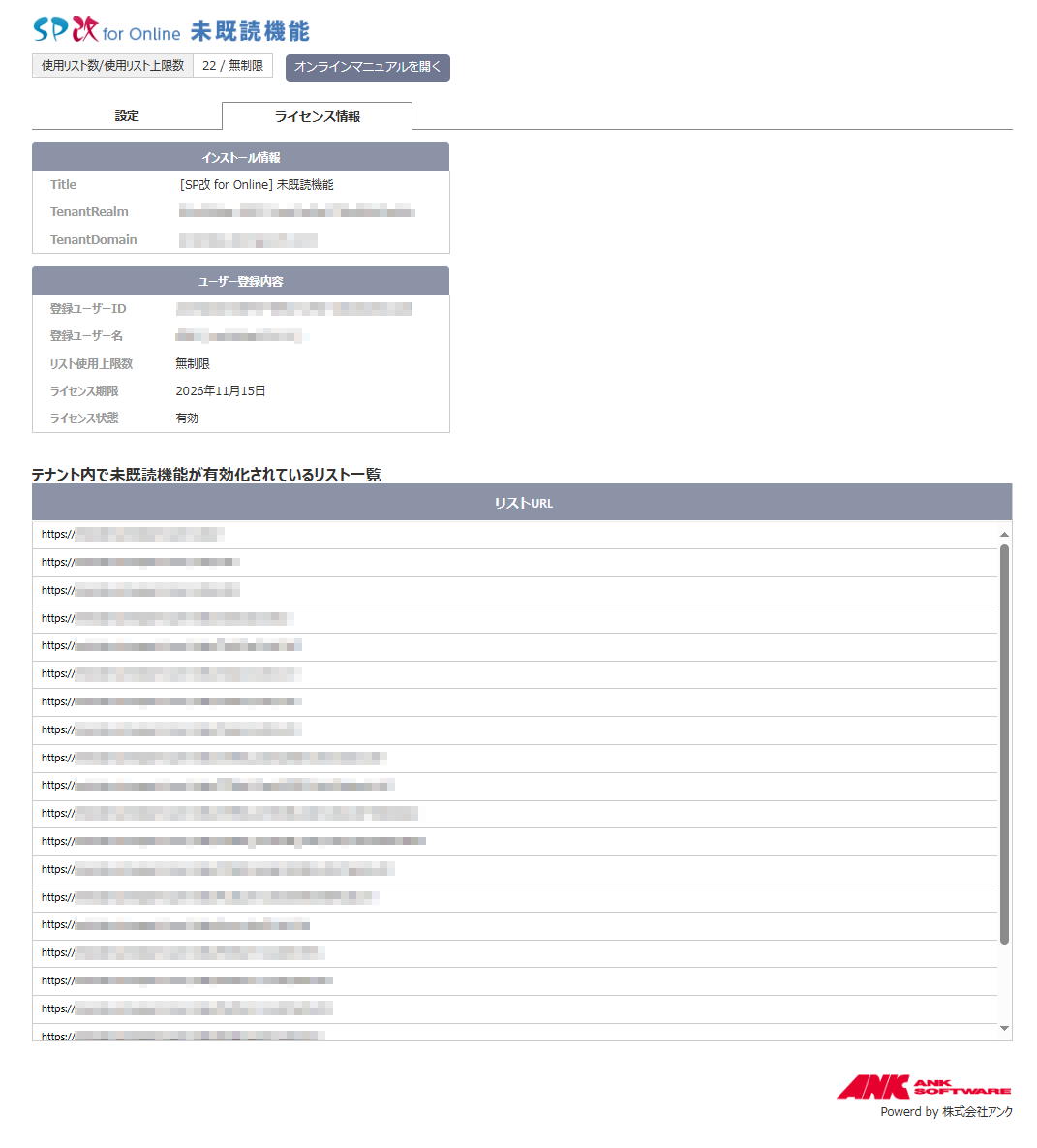 アプリ カタログ サイトの未既読機能の管理ページでは、ライセンスの契約状況やテナント内の未既読機能の使用状況など、ライセンスに関する情報を確認することが出来ます。